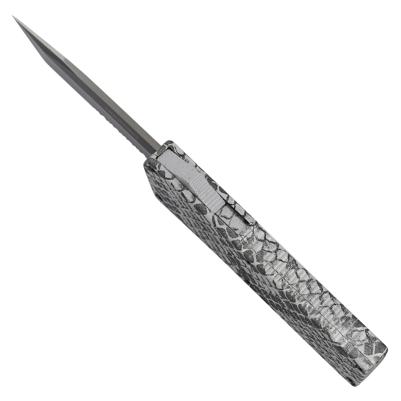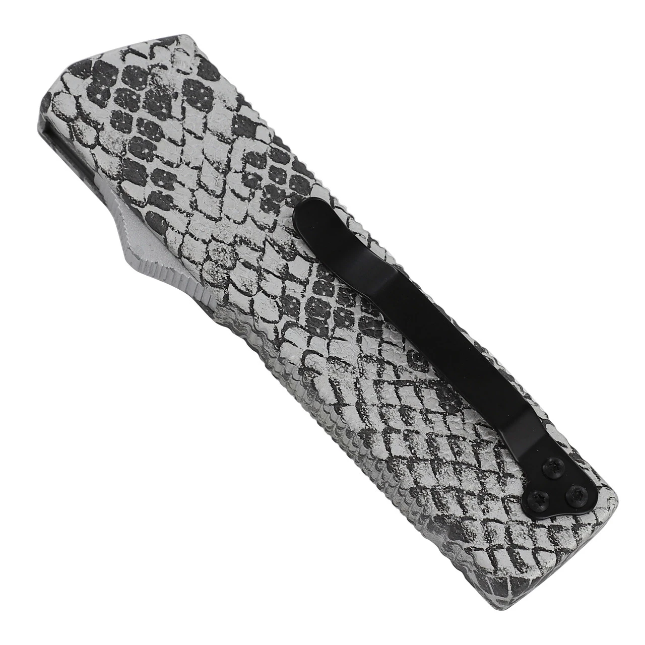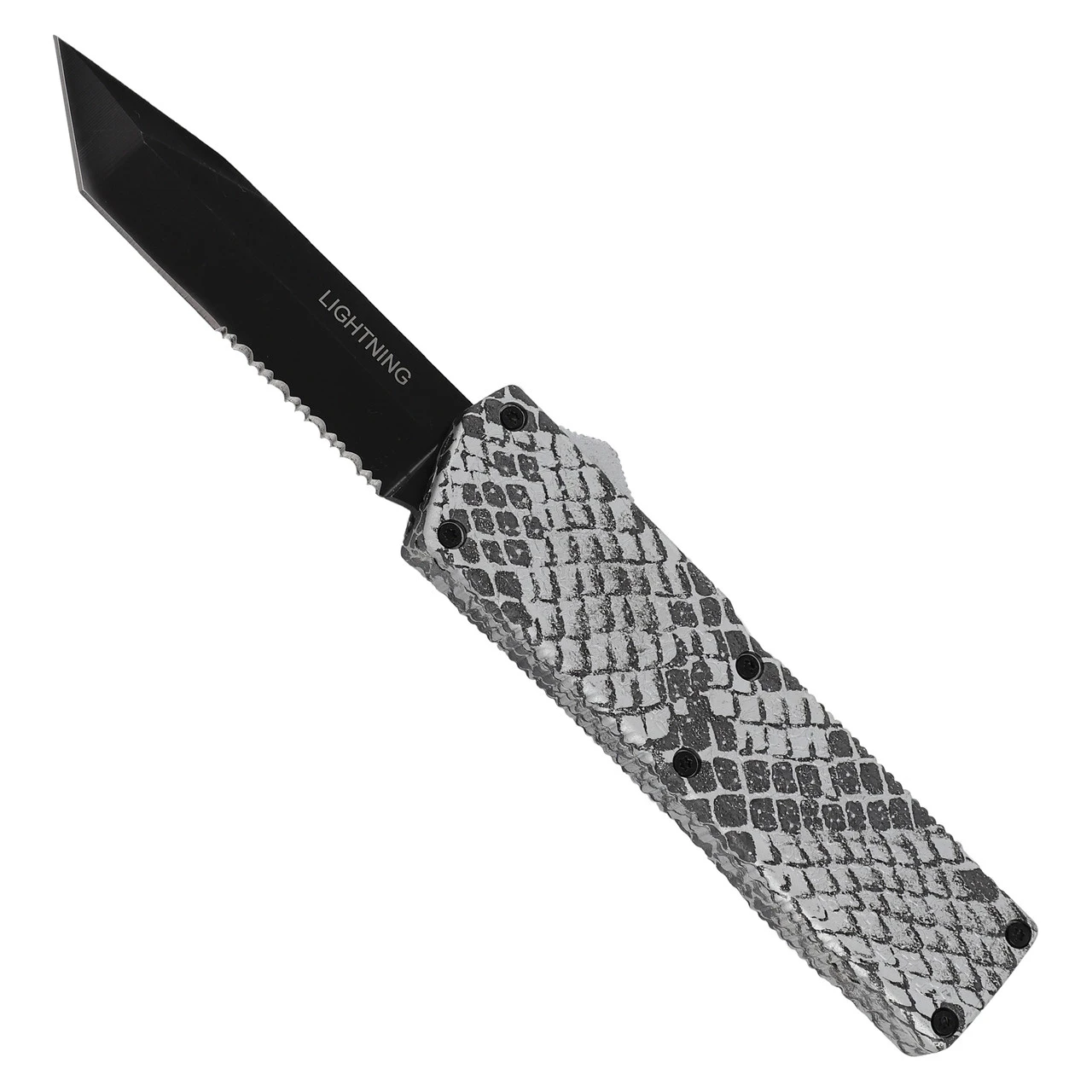 Features:Heavy DutyAutomaticDual ActionOut the FrontBlade Material: Stainless SteelTanto StylePartial SerrationAnodized FinishHandle Material: Zinc Alloy; SilverTextured GripSnakeskin DesignSilver Pocket Clip/HardwareSilver Firing Button Specifications:Overall Length: 7.85 InchesBlade Length: 3.25 InchesHandle Length: 4.55 Inches