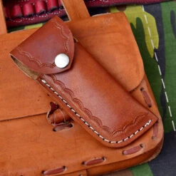 This knife is truly an elegant piece of masterful craftmanship. The clip point style blade is hand forged by expertly folding 1095/15N20 alloy steel over and over approximately 176-180 times, then tempered and quenched to produce the gorgeous wave pattern you see here. The handle has been hand-carved and stained a rich brown, which is complemented beautifully by the brass hardware & detailing. Featuring a double-walled construction, this knife is sturdy and will prove to withstand the test of time. The chiseled spine work along the handle is mimicked onto the spine of the blade, which perfectly align when the blade is opened using the brass lever. Included with this with this knife is a FREE hand tooled leather sheath that features a belt loop and snap closure for easy and safe carry. Overall Length: 9 inches, Blade Length: 4 inches