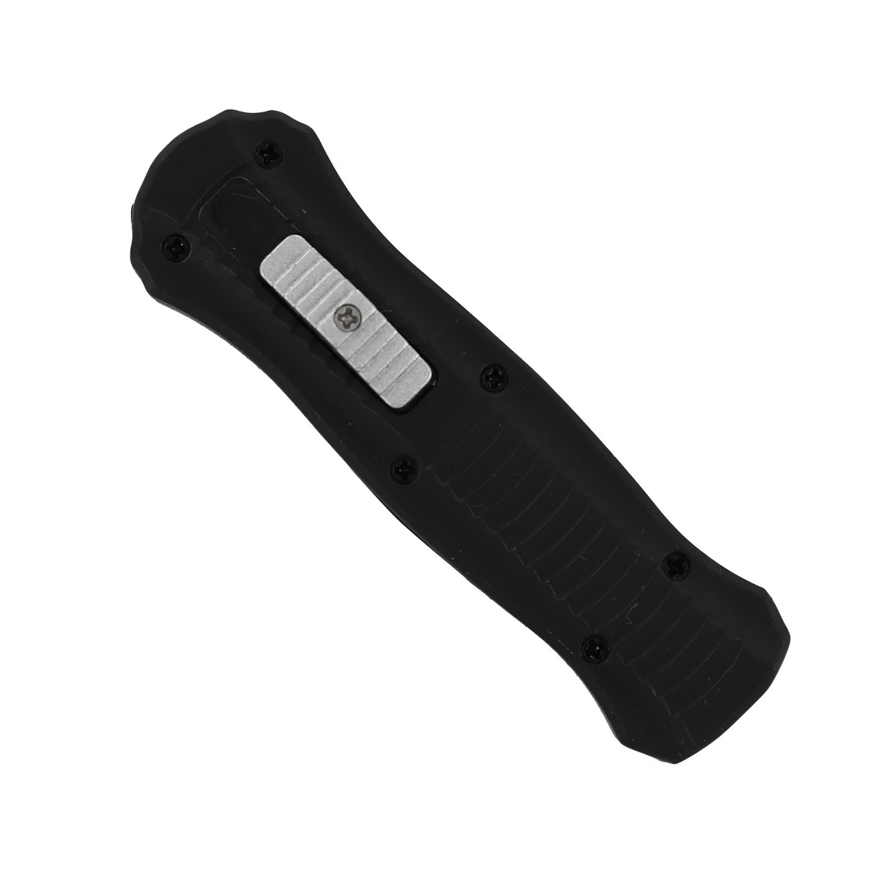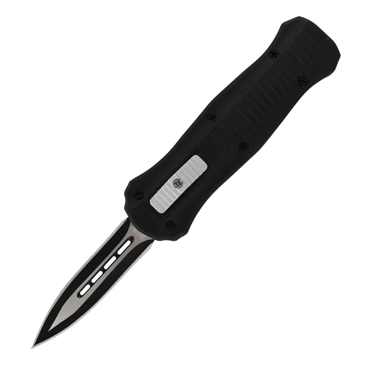 This little knife may not look so intimidating, but it certainly shouldn’t be underestimated. The stainless-steel blade has a sharp double edge and a dagger point tip. A two-toned finish on the blade adds appeal while offering scratch resistance. The curvy handle is made from zinc alloy and has a textured finish for a firmer grip. A slider is centered in the middle making this dual action blade ambidextrous. This knife is perfect for on the go due to its conveniently small stature. Included with your knife is a complementary black nylon sheath with belt loop and quick release. Overall Length: 5.5 inches, Blade Length: 2.125 inches