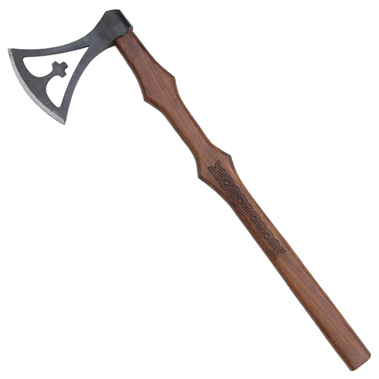 This beautiful axe is replicated after a 10th century Scandinavian axe found in Gotland. It is hand crafted from forged carbon steel with a weathered finish. The head of the blade has a traditional cross design in the center. Edged with a superior sharpness this blade will separate your enemies from their bodies in mire seconds. Whether you are a farmer or a Viking warrior with the help of this blade you will be unstoppable. The handle is made from a smooth sheesham with an oak stained finish. Featured on the handle is a Borre style motif. Ring chains build by repetition and juxtaposition of closed interlacing ribbons of equal-sided geometric shapes. This design was found on two strap ends from the eponymous Borre ship grave. Vikings most commonly carried sturdy axes that could be thrown or swung with head-splitting force and this fierce axe will match your Viking force. Overall Length: 28.82 Inches