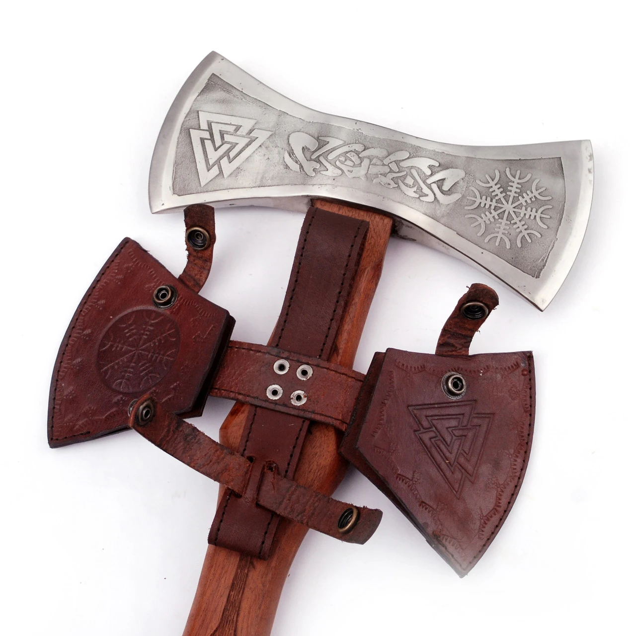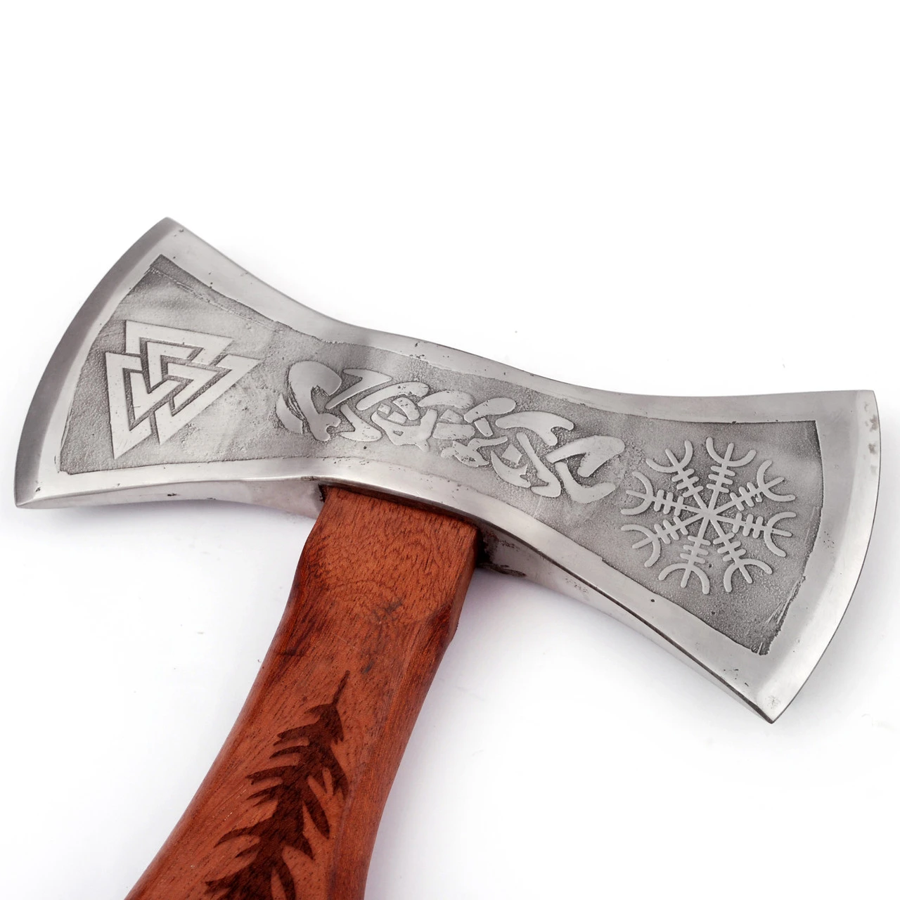 The fun has begun, and you are more than prepared with our hand forged double-bitted axe by your side. The cast carbon steel head features a standard sharpening. Engraved on both sides of the head of this collectible axe is the magical Icelandic stave known in Viking culture as the vegvÃsir, so the warrior wielding this axe will always find their way to victory, and the slain warriors knot, valknut, as a reminder of those who were not so lucky. On the center of each side of the head is engraved Norse symbols. The handle is made from durable sheesham wood that is contoured for a nice grip, and stained a rich warm brown. Etched onto the handle right below the blade is Yggdrasil better known as the tree of life. Genuine bovine leather cord wraps the bottom of the handle. Overall Length: 28.5 Inches, Blade Length: 3.75 Inches
