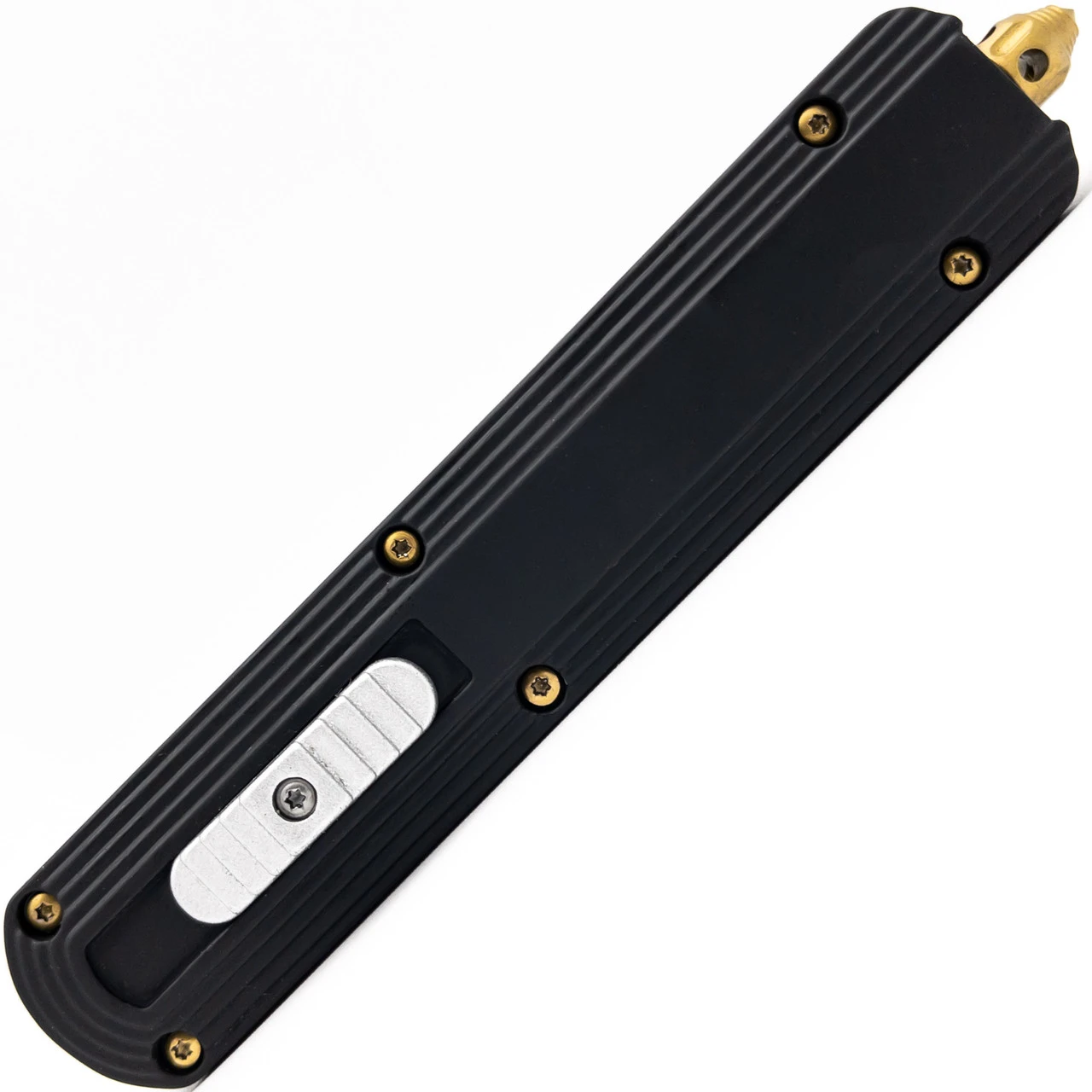 This magnificent automatic knife is equipped with a powerful dual action function, meaning all you need to do is push the thumb slide located on the top of the knife, back and forth to eject and retract the blade. It is amazing to see the blade propelled forward in one quick motion and then back again. The spear point blade is made from Damascus steel with a gorgeous wave pattern. The handle casing is zinc alloy with decorative beveled line running around the edge. Gold hardware looks stunning against the all-black handle, including a glass breaker featured on the end in case of emergency. Included with this knife is a FREE black nylon sheath complete with a belt loop for easy carry. Overall Length: 9.25 inch, Blade Length: 3.75 inch