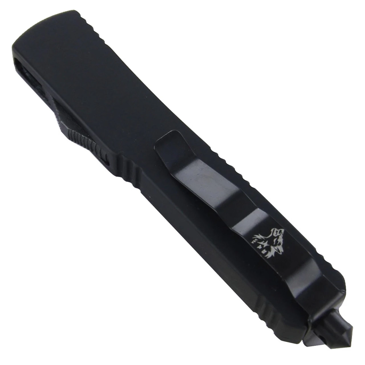 Be as prepared for hand-to-hand combat as the Special Forces with this sleek and stylish OTF knife. A simple matte black coated handle stealthily conceals the blade, which is released by the firing button on the side. The double-edge serrated dagger style blade is stainless steel with a black and metallic silver finish and has a nicely designed blood groove in the center on both sides. Seven cutout holes are sported on the blade for intricate detail. A black pocket clip is mounted on the back of the handle, and a glass breaker on the bottom that makes you well-equipped for any situation. These knives feature an improved internal mechanism for more consistent firing. Also included is a handy black nylon carrying case that clips at the front and has a Velcro closure on the back so you can fit it onto any belt. Overall Length (Blade Out): 8 3/8 inches
