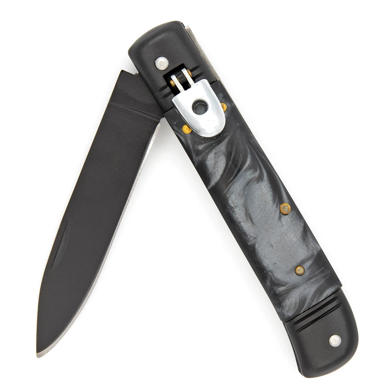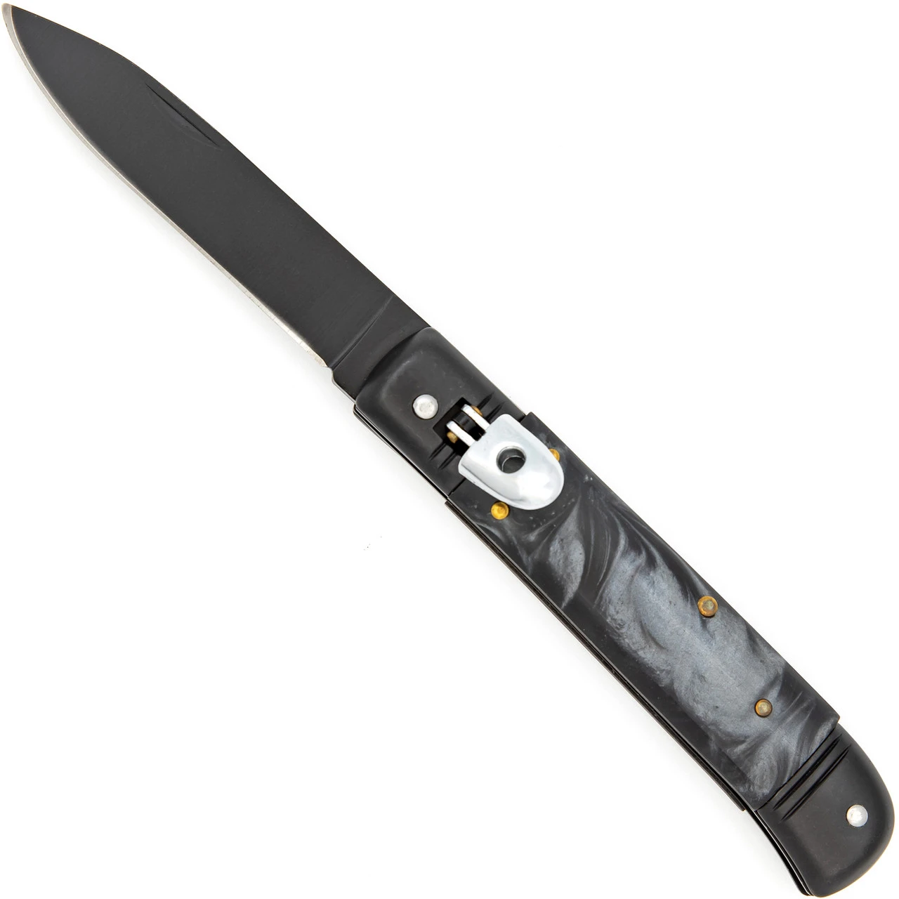 The stars scattered against the pitch-black expanse of freezing space are mirrored in the pearly black handle of the Splayed Stars Lever Lock Knife. The blade on this knife is black anodized stainless steel and the hardware matches so this knife is fully blacked-out, resulting in a cool and mysterious look. This knife is an automatic knife with a lever lock mechanism which means that there is a lever on the bolster. If this lever is pressed down then the blade will deploy, swinging out of the left side of the handle. You press the lever down again to unlock the blade so you can guide it back into the handle to close it. If you flip the lever up then the blade cannot deploy. For even safer carry and storage, the Splayed Stars Lever Lock Knife comes with its own black nylon sheath with a belt loop. Overall Length: 8 Inches, Blade Length: 3.5 Inches