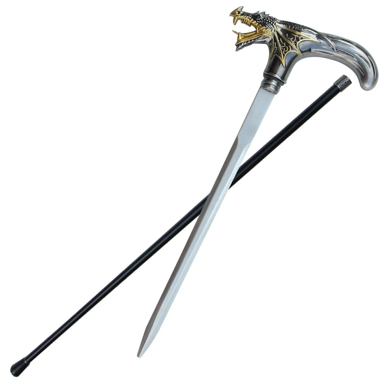 It is sleek with clean lines but as ones eyes climb up towards the handle you start to see very creative elements. The collar is such a small thing but when created with high Gothic arches with a brush metal finish the impact is great. Then you have the handle and oh what a handle it is. It is made from a zinc alloy also with a brushed metal finish. It comes in a Derby style with the front featuring a ferocious dragon head. Beady black eyes stare straight into your soul. The snout, mouth, and parts of the face fins are accented with gold. Not only does a cane have to be stylish and speak volumes about your personality but it has to be safe that is why the bottom features a non-slip tip. Inside is a 10.5 inch stainless steel blade just in case you find yourself in a dangerous situation. .Overall Length: 36.62 Inches