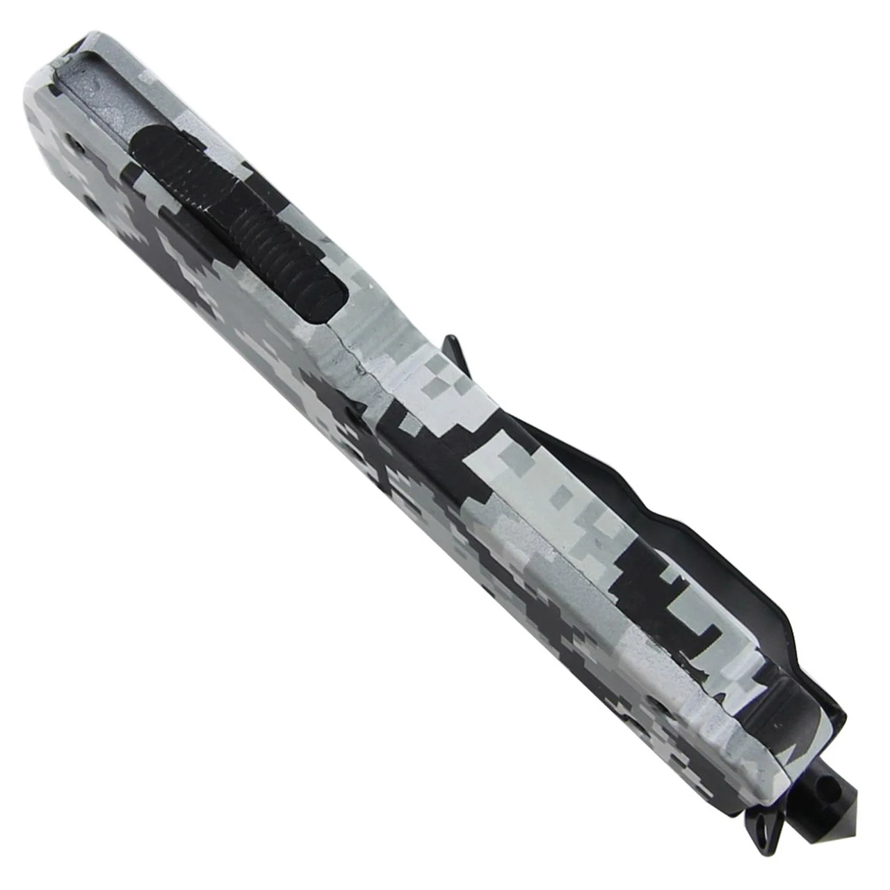 The popularity of automatic knives has risen significantly over the years. They usually are fast acting, have tactical features, and it goes without saying but they look badass! The durable two tone blade of this particular OTF is forged from stainless steel and comes in a tanto style, and is wicked sharp. The spine of the blade is riveted for extra flair. The handle is solidly built from zinc alloy steel and held together with 6 hex screws, and has a cool digital arctic camouflage finish. A dual action mechanism allows you to deploy and retract the blade by using a thumb slide located on the side of the handle. There is also a pocket clip and a glass breaker in case of emergency. A nylon quick release sheath is included to house your knife and transporting your blade in style. Overall Length: 8.25 Inches, Blade Length: 3.25 Inches