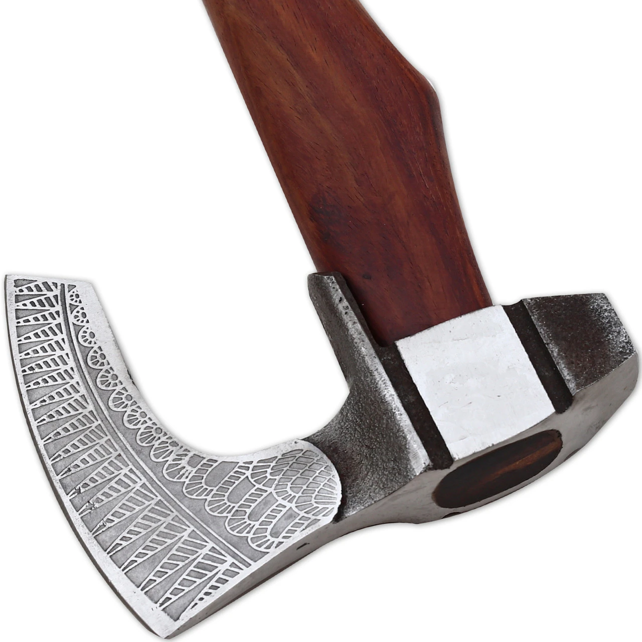 Possess the power of the mighty Thor with this beautiful axe made from high quality steel. The blade of this bearded axe is etched with intricate Viking-inspired motifs and comes with a standard sharp edge. Not only is it great for chopping, if you turn the axe around the flattened backside of the head also doubles as a hammer! This can be useful for tasks such as hammering in steaks or other objects securely into the ground. This is the perfect multipurpose tool to bring along with you on your next camping trip. When not in use, we recommend storing the axe in the tooled genuine leather sheath included for protection. Overall Length: 18 inches, Blade Length: 4.5 inches