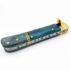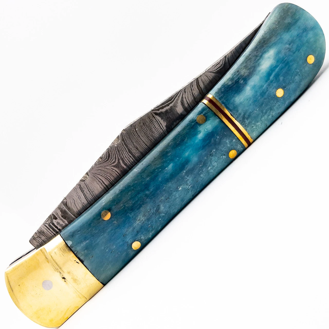 The Titan Falls Damascus Clip Point Automatic Switchblade Lever Lock Knife seems as if it were wrapped in a snapshot of a raging waterfall with the way the blue seems animated on the handle along with specks of white that look that the spray sent off at the bottom of a waterfall. It seems to have its own energy that exudes from it. The handle is composed of bone confidently held in place by brass hardware. The finish is smooth with a red and gold band around the pommel as a lovely accent. The blade itself is Damascus steel; the genius combination of 15N20 and 1095 high carbon steel. The combination creates wave-like patterns in the blade which compliments the clip point blade style perfectly. The blade also features hand-cut grooves along its spine which transition seamlessly into the semicircle design down the spine of the handle. The Titan Falls Damascus Clip Point Automatic Switchblade Lever Lock Knife features a lever lock system; simply press down on the lever to deploy the knife and flip the lever up when the knife is closed in order to secure it. This knife also comes with its own sheath. The seemingly effortless containment of the power that nature holds into an intense snapshot of writhing, crashing water. Here, is Titan Falls Damascus Clip Point Automatic Switchblade Lever Lock Knife. Overall Length: 8.95 Inches