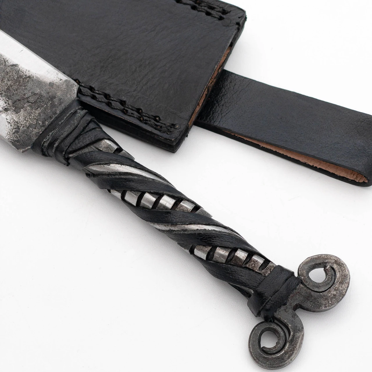 The Toppling Stream Medieval Dagger is a full tang, high carbon steel knife with a gorgeous and unique hand carved handle. A bluing technique was used to darken the center of the blade while the edges feature a standard sharpening and a polished silver gleam. The pommel of the knife is rolled into beautiful spirals to add character to the design as well as to distribute weight more efficiently. However, the truly unique aspect of this knife is the handle which has been hand carved during forging to resemble spiral steps descending down the handle with larger spirals separating them. Black Leather is wrapped around these long spirals resulting in the look of a leather stream coursing around steel rocks, inspiring its name. The Toppling Stream comes with a genuine leather sheath equipped with a belt loop for easy carry and safe storage. Overall Length: 11.5 Inches. Weight: 0.6 lbs.