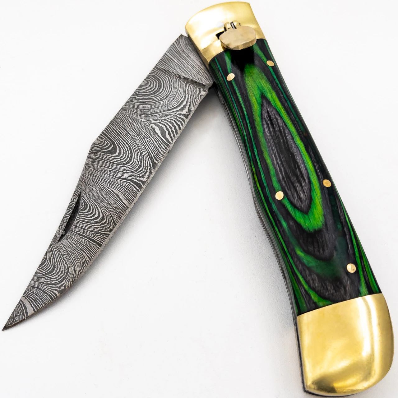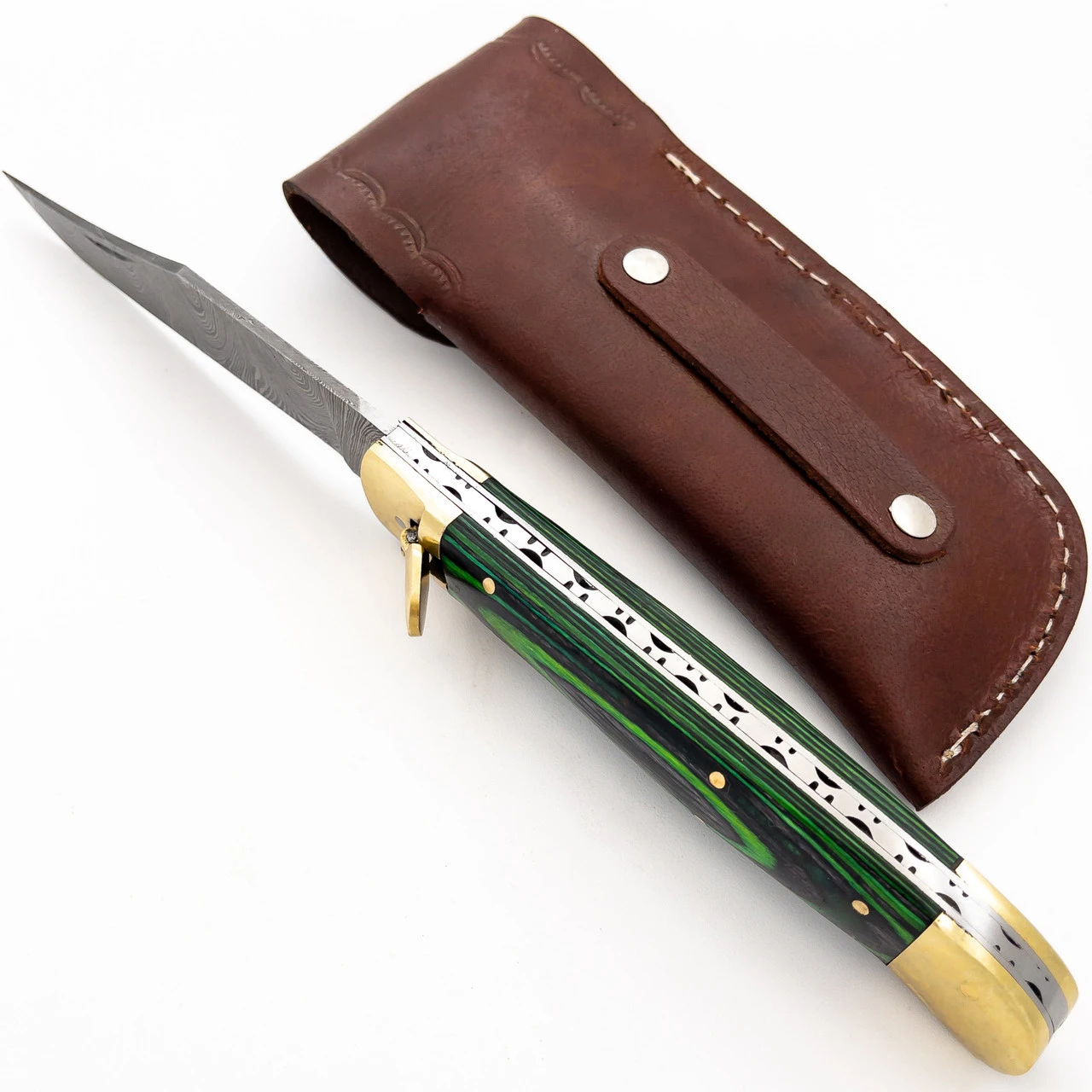 The Tractor Beam Large Clip Point Automatic Damascus Lever Lock Knife is a large lever lock knife with a Damascus clip point blade and black and green dyed wood grips in the handle. The colors as well as their circular shape creates a dynamic element to the design. It almost looks as though the circles are moving. The Damascus clip point blade sits in beautiful contrast to the handle, completing it perfectly. At 10.91 inches when open this knife is not small, it is large enough for any job. This knife features a lever lock mechanism which is simple yet effective. When the lever is up the knife will not open and when the lever is pressed down the blade deploys. The Tractor Beam Large Clip Point Automatic Damascus Lever Lock Knife comes with its own genuine leather sheath so you can be enraptured anywhere. Overall Length: 10.91 Inches. Weight: 0.69 lbs.