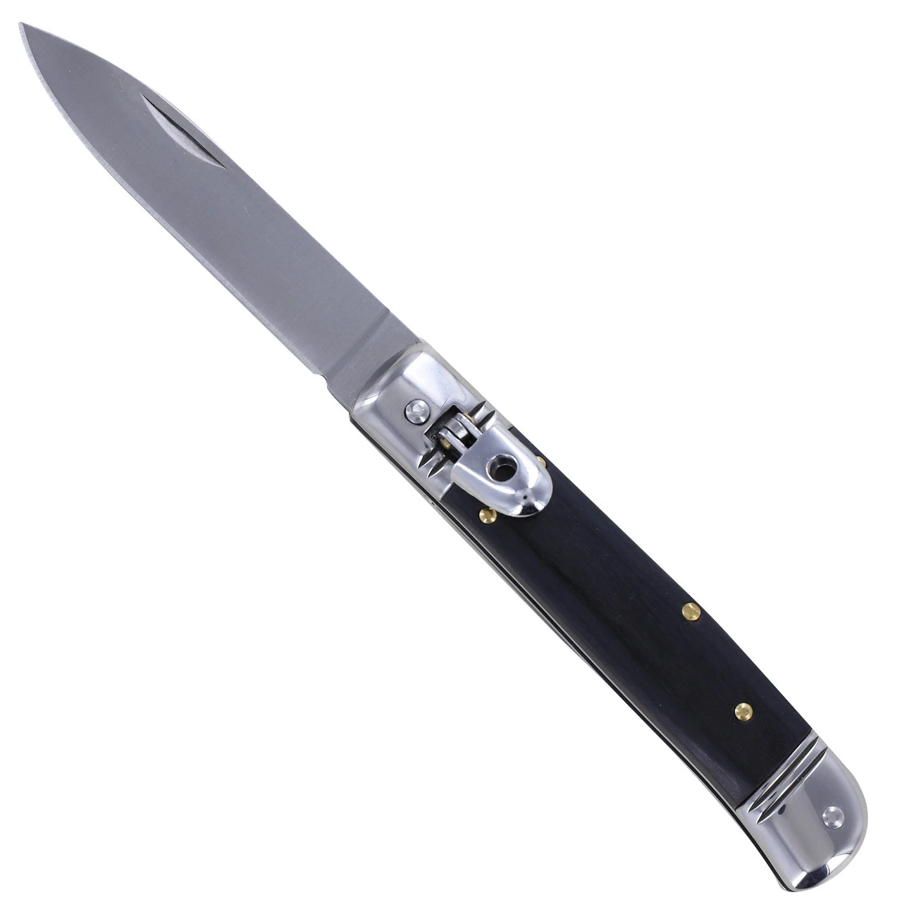 The Trial by Fire Automatic Lever Lock Switchblade Knife is an automatic switchblade with black wood grips. The knife has a lovely silver spey point blade and is outfitted with a lever lock. This is a mechanism to prevent the knife from deploying when not in use. The lever lock is located on the guard of the handle. If you push the lever down the blade will deploy; hold the lever down and guide the blade back into the handle to close the knife. Flip the lever into the up position to lock it and it will not deploy. The Trial by Fire Automatic Lever Lock Switchblade Knife also comes with its own black nylon sheath that is outfitted with a belt loop for easy carry. With the Trial by Fire Lever Lock Switchblade Knife you can be prepared for any trial.