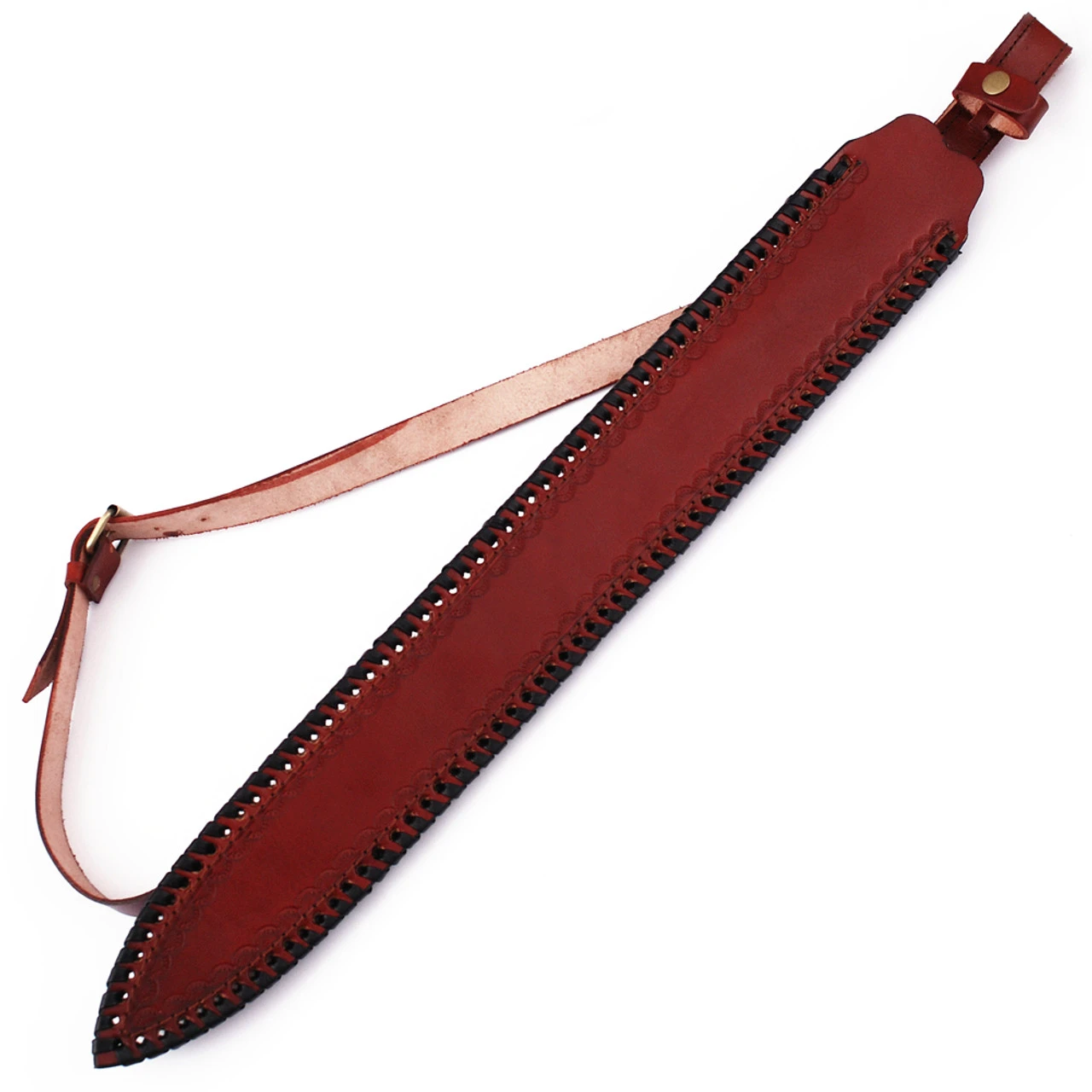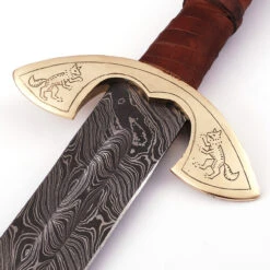 You have wolf blood running through your veins. Now is the time to show it by letting out your true Viking rage on the battlefield with this battle-ready Carolingian sword. The blade is forged from Damascus steel, with an exquisite wave pattern that is not only eye-catching but also durable and flexible. The Damascus blade is forged from a blend of 1095/15N20 steel, with an HRC of 58-60 and has been folded between 400-520 times. The guard and pommel are made from pure brass, and are adorned with etchings of a wolf face and in profile stance. The handle is wrapped is genuine bovine leather, with a wooden spacer in the middle. Included is a tooled leather sheath so you can carry this beautiful sword on your back. Overall Length: 31.75 inches, Blade Length: 24 inches