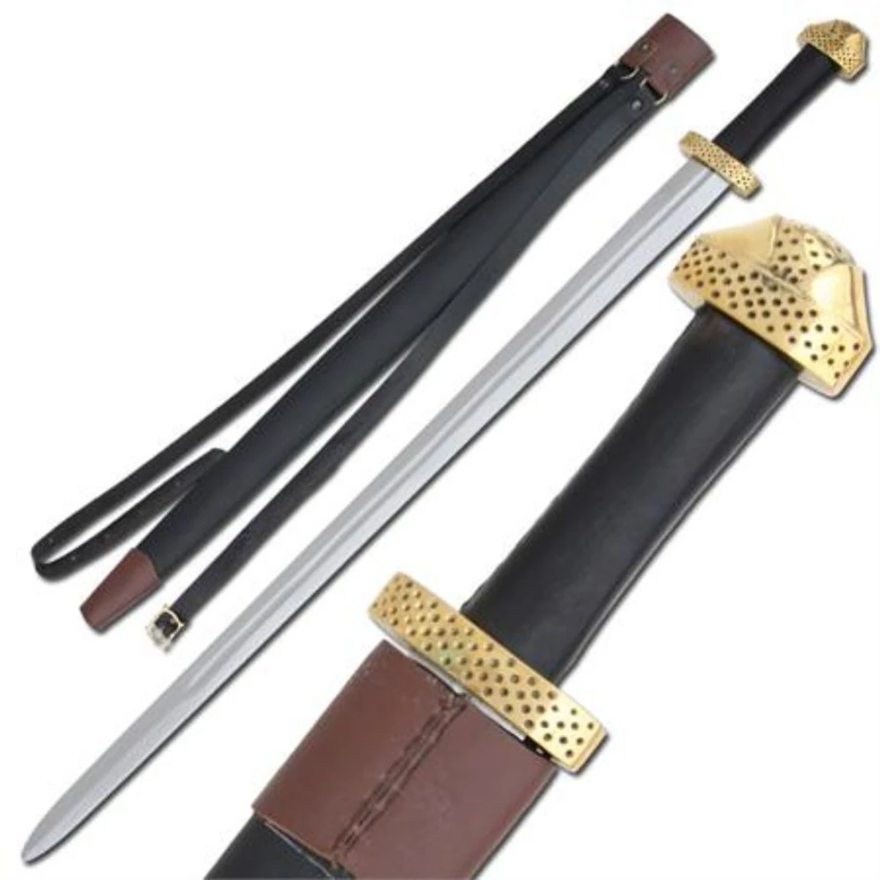This sword features a simple brass pommel and brass guard. Both are made with little holes to offer you a great balance. The handle is wood covered with black leather wrapped with waxed string tighten to perfection. The blade is the most prized possession of this sword. It carries a High Carbon Steel non sharp Double Edge. The blade has a deep fuller running their length, yet still has a single-handed hilt which often sported the lobed or cocked-hat style pommel. The fuller was used to increase the strength and flexibility of the sword while reducing the weight of the sword at the same time. This weight reduction and flexibility would allow the wielder to swing faster and harder strokes while, at the same time, allowing the sword to bend but not break when it hit bone. The Scabbard/Sheath of this sword is constructed from Natural Wood (which is visible) and its stitched with real leather. The chape on the scabbard/sheath is a simple brown leather design. This scabbard also sports a long belt strap which can be adjusted to fit your size around your waist. Overall Length: 38.25 inch