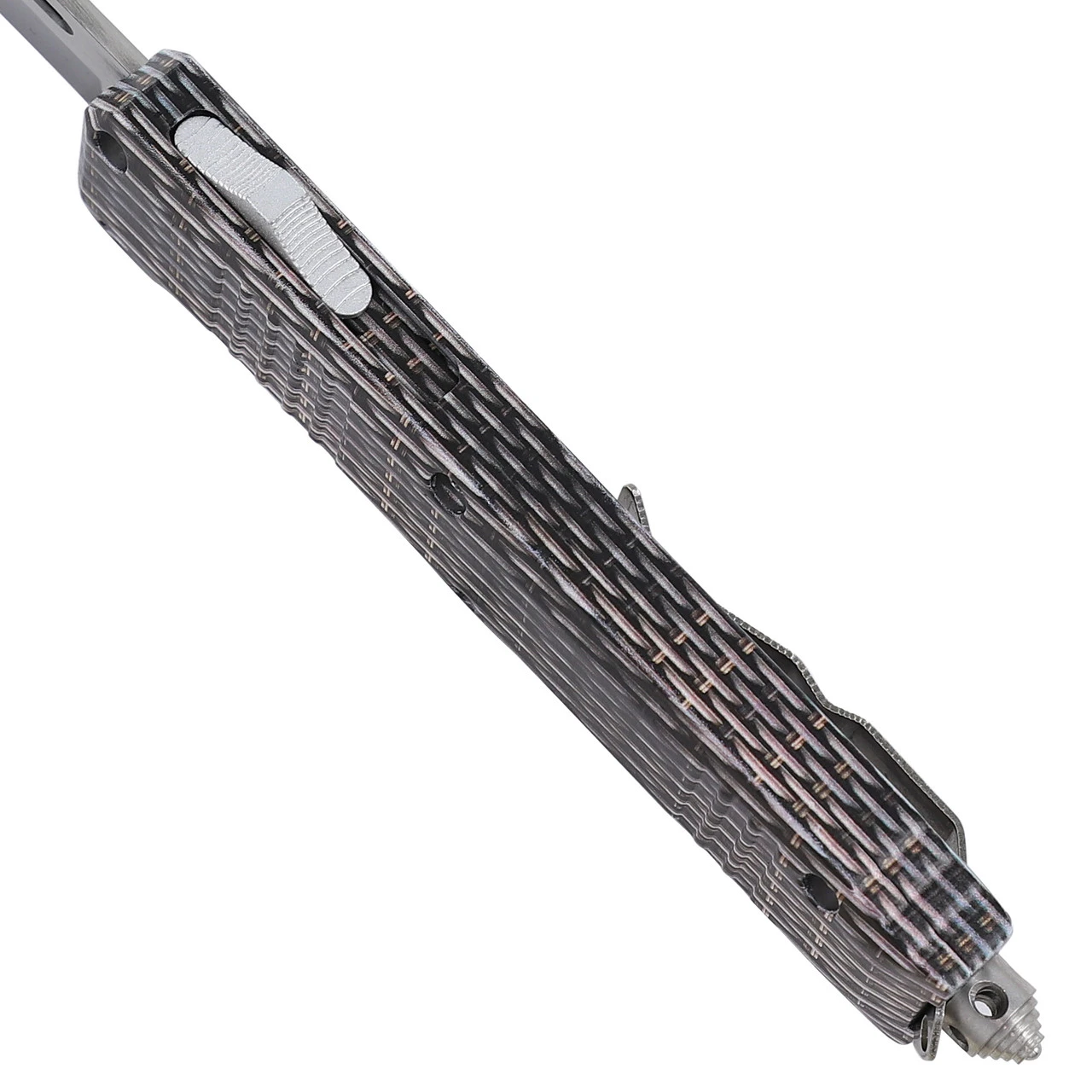 This heavy duty out the front knife exudes coolness. The handle is made from a premium zinc alloy aluminum held together with 6 durable hex screws and features a carbon fiber finish. Just stunning! The dual action slide trigger deploys and retracts the blade with extreme speed flawlessly. The butt comes equipped with a silver glass breaker in case of emergencies. The two-tone blade is composed of stainless steel and comes in a classic drop point style. Included is a quick release black nylon sheath.