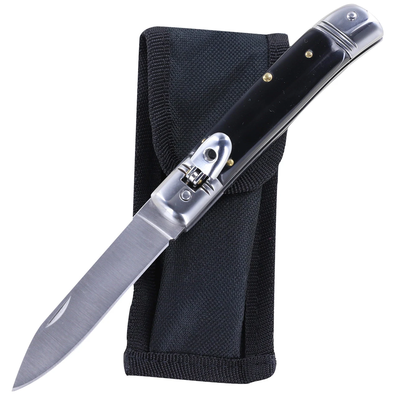 As is the Wisp of Smoke Automatic Lever Lock Switchblade Knife. This knife has an ABS handle that is primarily black but features small wisps of white on the sides and some even have the wisps creeping onto the front and back of the handle. These small intricate wisps bring detail and thought to the design and also a profound uniqueness. No two of these knives will be the exact same so yours will be truly one of a kind. This knife has a stainless steel spey point blade so the blade will never rust. The Wisp of Smoke Automatic Lever Lock Switchblade Knife features a lever lock on the handle for safety when the knife is not in use. The knife is locked when the lever is in the up position and flipping the lever into the down position and pressing it down will cause the blade to deploy. The Wisp of Smoke Automatic Lever Lock Switchblade Knife also comes with its own complimentary black nylon sheath that has a belt loop for easy carry.