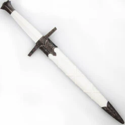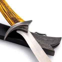 Woods are the root of life. All things begin and congregate there. The Wood Borne Medieval Dagger is a gorgeous dagger with a thin blade and light wood colored handle. The pommel is partially the wood-colored handle and the other part is a silver cap affixed to the end giving the dagger a natural elegance. The guard is asymmetrical and carved with texture and runes on both sides. A thin, single edged blade protrudes from the handle which results in a unique design for a dagger. The Wood Borne comes with a hard scabbard that is a matte black with a silver chape and locket carved with runes similar to the guard. This dagger is perfect for any collector, cosplayer, or reenactor. Overall Length: 11.5 Inches. Weight: 0.45 lbs.