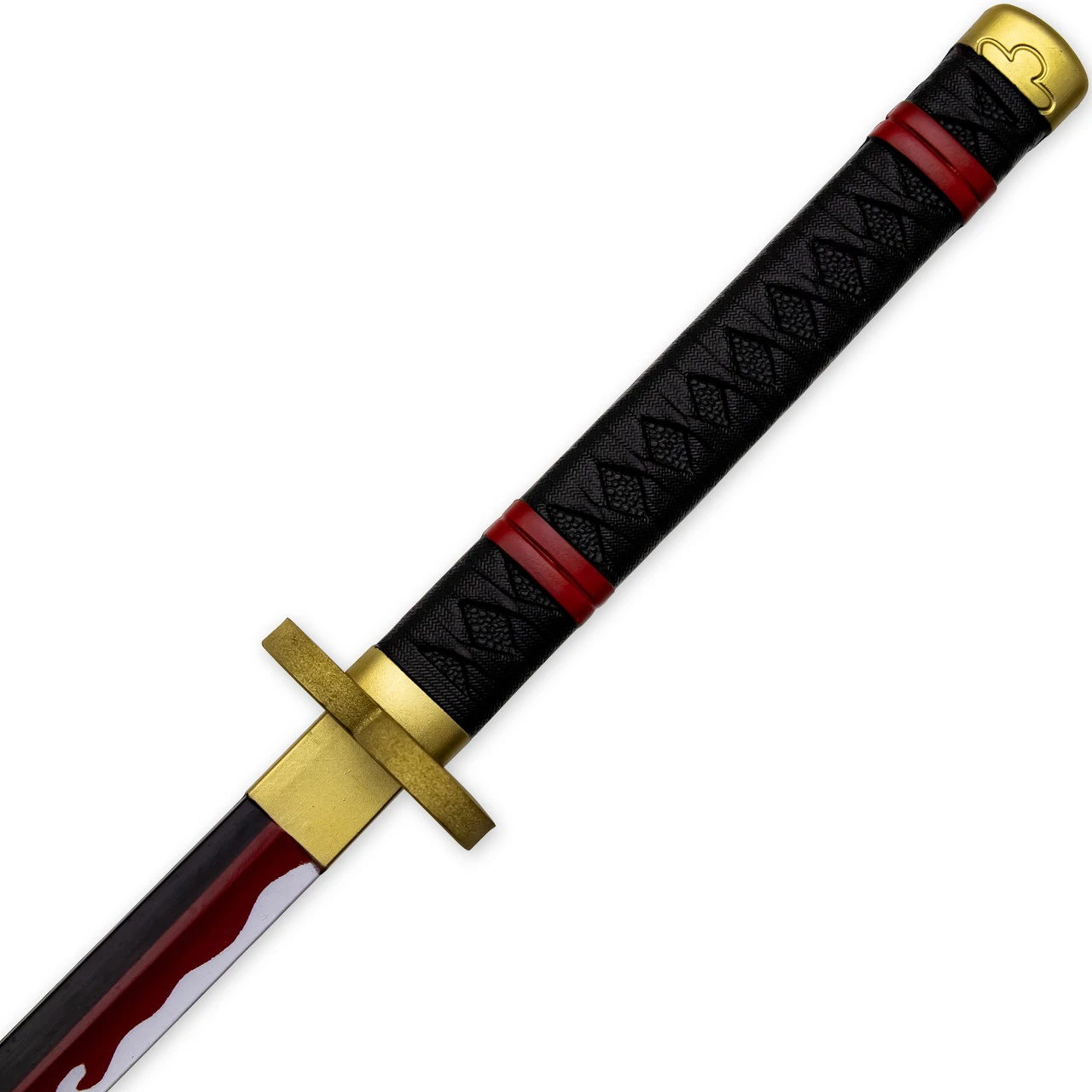 While the Enma sword is normally a vibrant shade of purple, it takes on a stark black appearance once imbued with what is known in the anime as Busoshoku Haki, which is basically the user’s spiritual energy. This replica may be made of foam, but it is certainly no children’s toy. This Imbued Haki Enma katana sword is composed of polyurethane foam and features a 10 mm fiberglass core. Polyurethane foam is both durable and flexible, and the added fiberglass core creates a strong sword that can be used for cosplay as well as kicking bad guy butt in mock battle. The base of the blade is black, and the hamon is painted vibrant shades of red and white in a dancing flame design. The handle is molded to simulate a traditional Japanese wrapping in black cloth, with an underlayer of black ray skin. Painted red bands are also featured on the handle for added detail. An ornate gold pommel tops the handle, and the gold foam guard that has a trefoil design comes detached for easy assembly. A mock habaki separates the blade from the handle. Included with your purchase is a matte black hard plastic scabbard with painted gold detailing and vinyl stick-on floral decals to perfectly match the sword in the anime series. Due to some slight imperfections in the scabbard design, this replica cosplay sword is offered at a deal you simply CANNOT pass up!