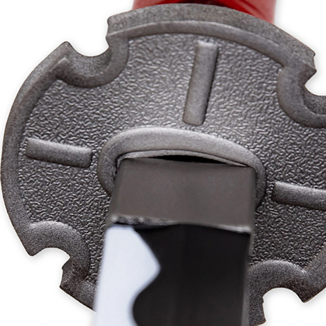 This replica may be made of foam, but it is certainly no children’s toy. This Sandai Kitetsu katana sword is composed of polyurethane foam and features a 10 mm fiberglass core. Polyurethane foam is both durable and flexible, and the added fiberglass core creates a strong sword that can be used for cosplay as well as kicking bad guy butt in mock battle. The base of the blade is black, and the hamon is painted white in a dancing flame design. The handle is molded to resemble a traditional Japanese wrapping in red cloth, with an underlayer of black ray skin. A painted silver band is also featured on the middle of the handle. A painted silver pommel tops the handle, and a silver foam guard shaped like a rounded cross comes detached for easy assembly. A mock habaki and fuchi separates the blade from the handle, with a ridge in between the two to nest the hand guard. Included with your purchase is a vibrant red hard plastic scabbard with painted black and silver detailing to perfectly match the sword in the anime series. Overall Length: 40.5 inches, Blade Length: 29.5 inches